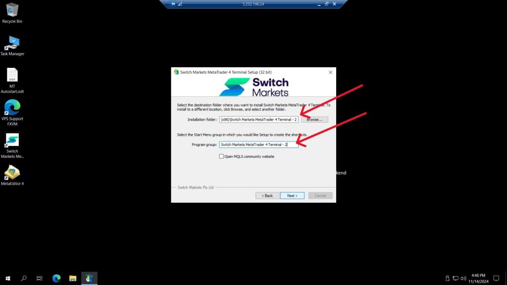 4. Go to the Installation Folder field and change the path, it’s recommended to just add a 2 in the end of the path and Program group (for the next MT4 you can add 3, then 4, and so on).